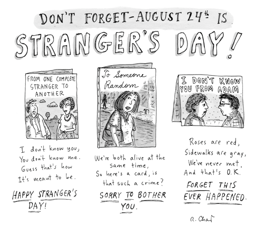 August 24 is Stranger’s Day. Say “hello” to someone you don’t know! Practice saying “hello” to someone you don’t know! (via The New Yorker)